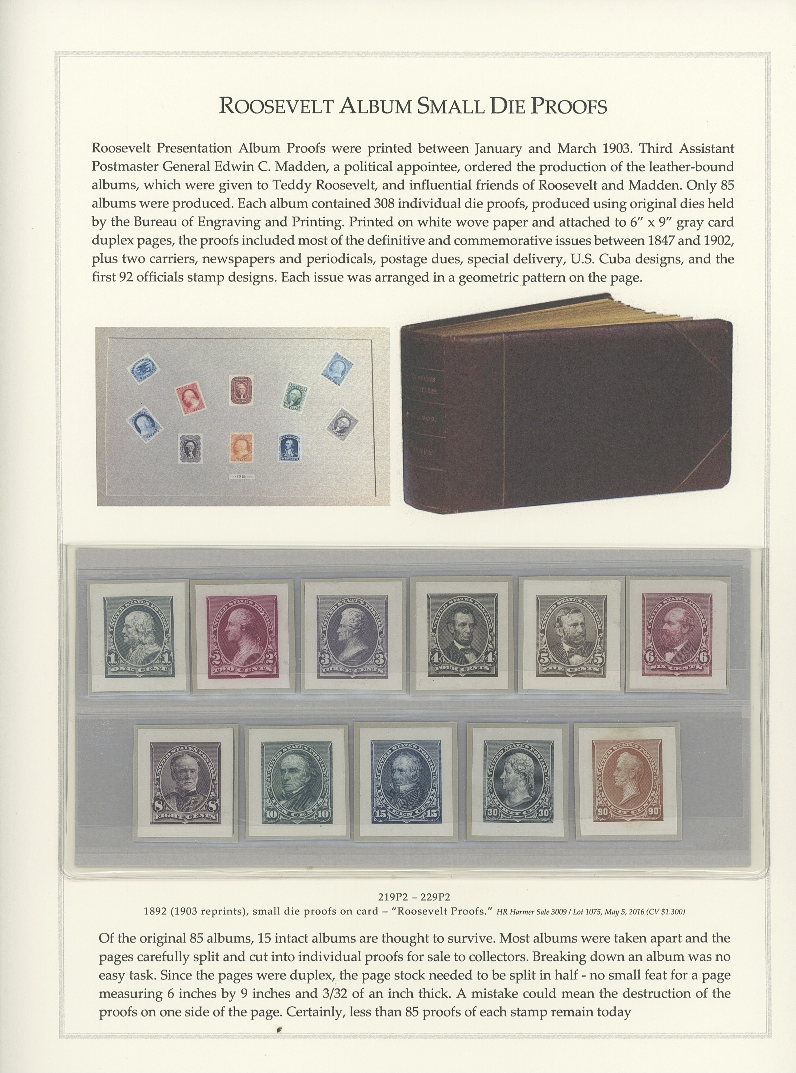 Small die proofs, commonly referred to as Roosevelt Album Proofs, consisted of 308 designs representing most issues from 1847 through 1902. A total of eighty-five leather-bound gold gilt embossed album sets were printed by the Bureau of Engraving and Printing in 1903 and distributed to friends and political cronies of the Post Office Department. The proofs were printed on a fibrous, white wove paper, mounted on gray cardstock and are quite rare. In addition, another special printing of 413 different small die proofs was made for the 1915 Panama-Pacific Exposition. These were produced on a soft, yellowish wove paper, and are extremely scarce, with 3–5 copies of each known today.